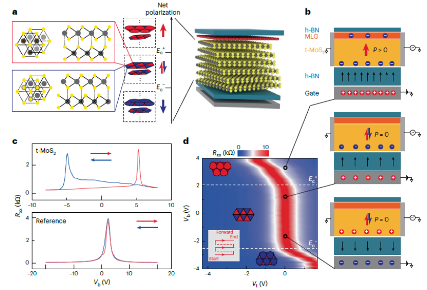 圖 2. 在多層扭曲 MoS2 中觀察到的鐵電性。a,石墨烯-MoS2 異質結構的器件示意圖。由于扭曲角度和應變的變化,每個界面處的反鐵電疇將有所不同(示意性地繪制了兩個界面)。但是,幾乎解耦的界面(在補充第 10 節中證明)允許通過對所有界面進行數值平均來評估凈極化 P。說明了電場 Ec 對疇極化的切換動力學。b,庫侖屏蔽的工作機制。器件示意圖突出顯示了三種代表性狀態,其中 t-MoS2 指的是 a 中所示的多層扭曲 MoS2。門控場(h-BN 層中的黑色箭頭)被本征電子摻雜的 MoS2 屏蔽,但可以極化由 MoS2 制成的界面鐵電體。鐵電極化場 P 隨后改變了頂部單層石墨烯的狀態。這里我們展示了 E > E+c(頂部,P > 0)、0 < E < E+c(中間,P = 0)和 E−c < E < 0(底部,P = 0)的情況,其中 P = 0 表示石墨烯未摻雜。c,頂部:在 Vb 上來回掃描時觀察到磁滯傳遞曲線。我們強調,磁滯不是鐵電 BN 的結果,因為沒有扭曲 MoS2 的另一部分石墨烯沒有顯示任何磁滯(底部)。d,顯示庫侖屏蔽機制的完整相圖。極性疇網絡的疊加示意圖針對單個扭曲界面;然而,由于相鄰界面的解耦,多層樣品中的疇壁運動可以用單個界面的運動來表示。對應于 b 中的示意圖,三個代表性狀態用黑色圓圈突出顯示。插圖:柵極掃描方案。