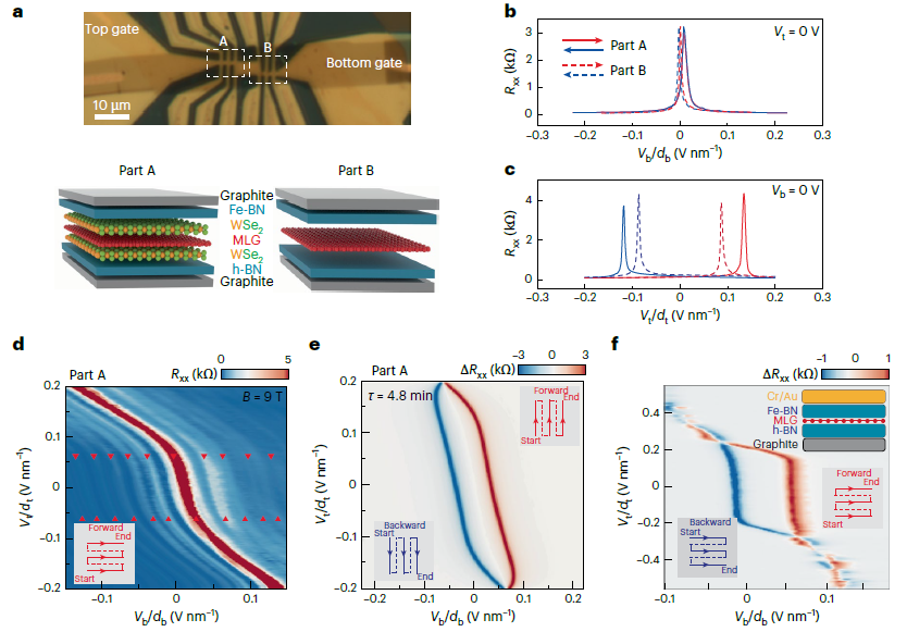 圖 1. 單層石墨烯異質結構中的鐵電性。a,具有兩個不同部分的器件的光學特性,并附有結構示意圖。單層石墨烯 (MLG) 以紅色突出顯示。請注意,表現出鐵電性的頂部 BN (Fe-BN) 與底部六邊形 BN (h-BN) 具有不同的符號。b,c,對于 A 部分和 B 部分,通過掃描頂部柵極 (c) 可以觀察到磁滯電阻曲線,但通過掃描底部柵極 (b) 則觀察不到。d,A 部分的磁場 B = 9 T 的二維電阻映射(參見插圖中的掃描配置)。CNP 軌跡的近乎垂直的特征代表了庫侖屏蔽機制,其中 Vt 似乎停止工作。朗道能級光譜還可以實現低電阻電子狀態的可視化。顯然,庫侖篩選取決于特定的柵極,即該器件中的 Vt(用紅色三角形表示),而不是由頂柵極和底柵極貢獻的位移場。插圖:柵極掃描圖。e,A 部分頂柵極向前和向后掃描之間的磁滯回線。弛豫時間約為 4.8 分鐘(參見補充部分 1 中補充圖 1j 中的測量值)。插圖:兩種掃描配置。f,在另一個具有長弛豫時間的器件中,頂柵極向前和向后掃描之間的磁滯回線很顯著。插圖:兩種掃描配置和器件示意圖(參見補充部分 2 中的更多特性)。d,BN 薄片的厚度。