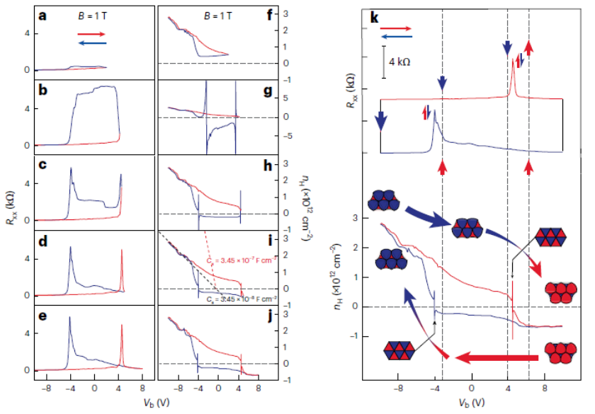 圖3. 極化切換動力學。a–j,通過改變正柵極的掃描范圍來表征縱向電阻(a–e)和霍爾載流子密度(f–j)。這里,Vb 的負極限固定在 −10 V,正極限分別設置為 2 V、4 V、4.5 V、5 V 和 8 V。雖然在 a 中未實現正極化,但庫侖屏蔽恰好發生在 b 中的 CNP 位置上。疇壁動力學可以在 c 中得到最好的呈現,其中在正向掃描期間未訪問 CNP,但電子狀態在反向掃描過程中繼續將 CNP 從空穴摻雜傳遞到電子摻雜(如 h 所示)。在 i 中,底柵的屏蔽電容(Cs)用黑色虛線擬合,這與預期的 10 nm h-BN(紅色虛線)的計算值不同。 k、箭頭(頂部,Rxx)和極性域(底部,nH)在整個掃描范圍內變化的電荷極化圖示。
