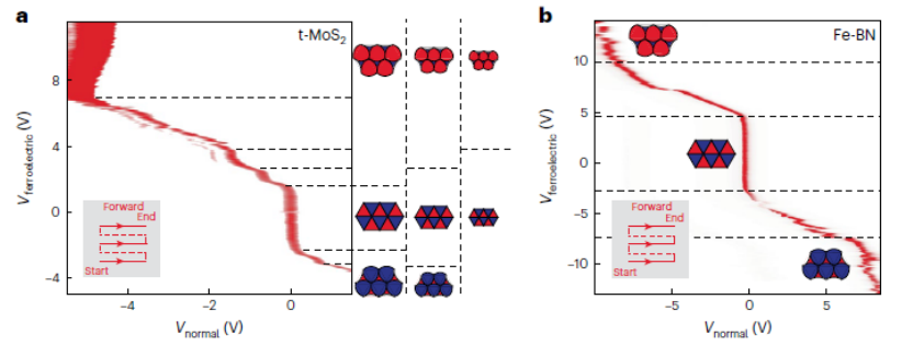 圖 4. 鐵電階梯。a、在多層扭曲 MoS2 器件的相圖中觀察到的多個庫侖屏蔽階梯。附有極性疇網絡層分辨切換的示意圖,其中較小的疇需要較高的切換場。b、典型的 BN-石墨烯異質結構的相圖,其中較少的階梯表示極性疇的分布更均勻。插圖:柵極掃描配置。請注意,這里在不同類型的器件中使用統一的 Vferroelectric 和 Vnormal 標記,分別代表有和沒有磁滯回線的柵極。