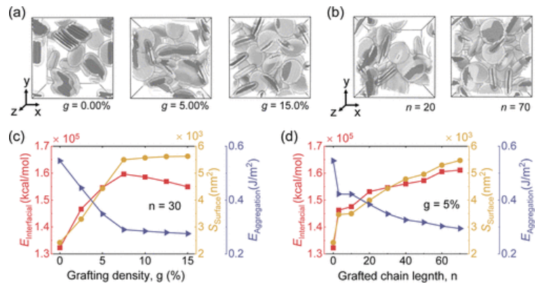 Fig 4. 不同(a)接枝密度和(b)接枝鏈長度的石墨烯/p(MMA)納米復合材料中石墨烯簇的高斯密度表面積的演示,其中為了清晰起見省略了 p(MMA)鏈。石墨烯/p(MMA)納米復合材料的 EInterfacial、SSurface 和 EAggregation 隨(c)接枝密度和(d)接枝鏈長度的變化。