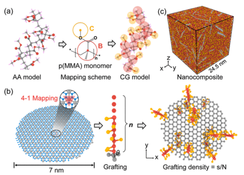 Fig 1.  (a) 粗粒化(左)全原子(AA)聚(甲基丙烯酸甲酯)p(MMA)模型到(右)粗粒化(CG)模型,中間面板顯示 p(MMA)的化學結構和每個單體兩個珠子的映射方案。(b) 制備基本的 p(MMA)接枝石墨烯構建塊用于石墨烯/p(MMA)納米復合材料:(左面板)石墨烯的 CG 模型,每個 CG 珠子(灰色)代表四個碳原子(藍色),即 4–1 映射方案;(中間面板)p(MMA)接枝過程,其中 n 表示接枝聚合物鏈長度,θ表示兩個結合的石墨烯珠子與一個聚合物珠子 B 之間的角度;(右面板)p(MMA)接枝石墨烯構建塊的快照,接枝密度為 g = s/N,其中 s 和 N 分別代表接枝位點的數量和每個石墨烯片的總石墨烯珠子數量,p(MMA)鏈以相等的概率接枝在石墨烯的兩側。(c) 大塊石墨烯/p(MMA)納米復合材料系統的快照,g = 5%和 n = 30。