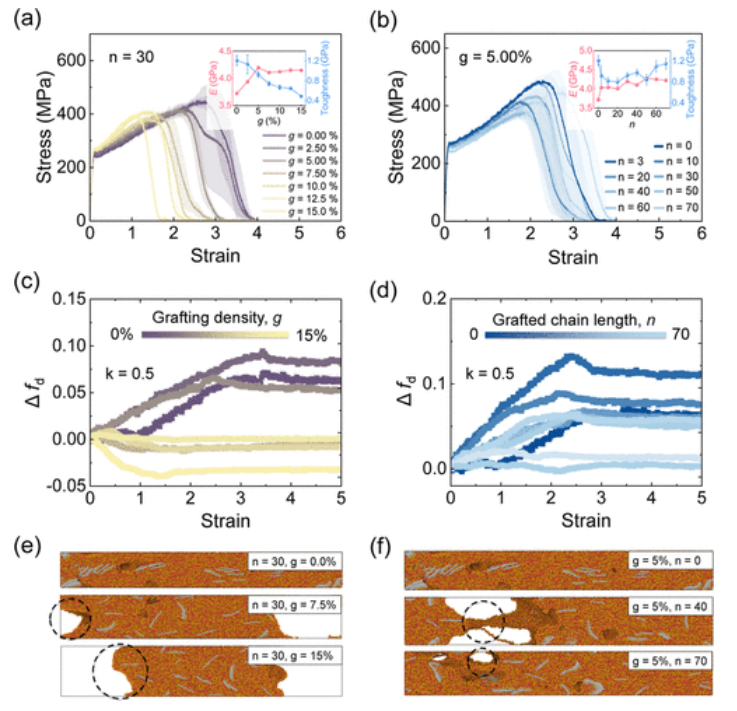 Fig 5. 石墨烯/p(MMA)納米復合材料的應力-應變曲線,(a) 不同接枝密度 g (n = 30) 和 (b) 接枝鏈長度 n (g = 5.00%)。誤差帶來自于沿 x、y 和 z 方向的獨立拉伸測試。插圖顯示了石墨烯/p(MMA)納米復合材料的楊氏模量 (E) 和韌性。石墨烯/p(MMA)納米復合材料的分散性 fd (k = 0.5) 隨應變的變化 (c) 在固定 n、變化 g 的情況下,以及 (d) 在固定 g、變化 n 的情況下。納米復合材料在應變為 3 時的快照,(e) 不同接枝密度和 (f) 接枝鏈長度。