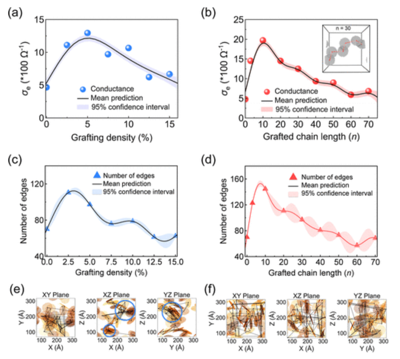 Fig 7. 石墨烯/p(MMA)納米復合材料的電導率,(a) 不同接枝密度和 (b) 接枝鏈長度,其中實線和誤差帶分別為高斯進展回歸預測和 95%置信區間。面板(b)中的插圖顯示了接枝數 n = 30 的納米復合材料的一個滲流路徑快照,紅色虛線表示電子傳輸路徑。石墨烯/p(MMA)納米復合材料系統中具有(c) 不同接枝密度和(d) 接枝鏈長度的邊數。誤差條小于符號。(e,f) 石墨烯/p(MMA)納米復合材料中石墨烯片的滲流網絡,g = 2.5%和 g = 5.0%。藍色圓圈表示聚集的邊。