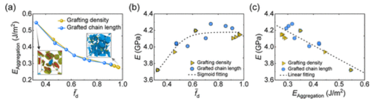Fig 6. 石墨烯/p(MMA)納米復合材料的聚合能量 EAggregation 隨分散性參數 ??d????fd¯ 的變化(其中 k = 0.5),顯示出更高的 ??d????fd¯ (表示改善的分散性)對應于較低的 EAggregation。插圖展示了 grafting 密度 g = 0.0% 和 g = 15% 的納米復合材料的石墨烯網絡快照。(b) 所有系統中 ??d????fd¯ 與 E 之間的關系,黑色虛線表示 S 型擬合,平臺值為 4.18 GPa。(c) EAggregation 與 E 之間的線性相關性。