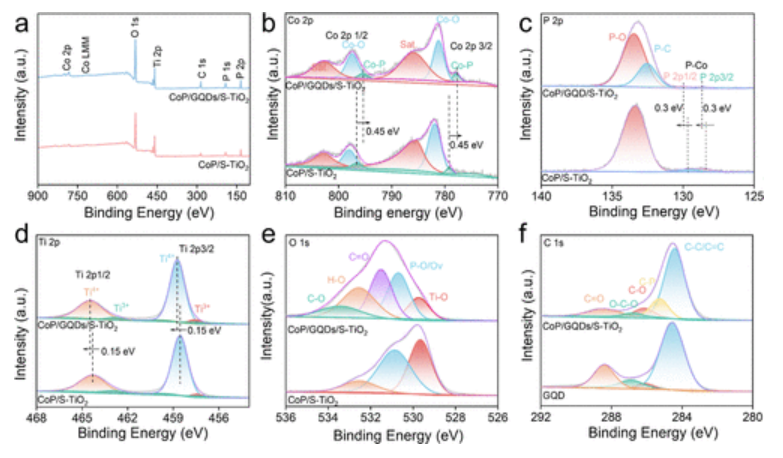 Fig 3. (a) CoP/S–TiO2 和 CoP/GQDs/S–TiO2 的 XPS 光譜。 (b) CoP/S–TiO2 和 CoP/GQDs/S–TiO2 的 Co 2p 高分辨率 XPS 光譜,(c) P 2p,(d) Ti 2p,(e) O 1s。 (f) CoP/GQDs/S–TiO2 和 GQDs 的高分辨率 C 1s 光譜。