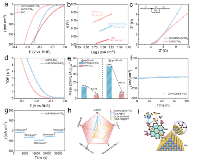 Fig 4. (a) 在 2 mV s–1 掃描速率下,CoP/S–TiO2、CoP/GQDs/S–TiO2 和 Pt/C 在 1 M KOH 中的 LSV 曲線。(b) Tafel 斜率。(c) Nyquist 圖。(d) TOF 計(jì)算。(e) 相對(duì)于 CoP 催化劑質(zhì)量的活性歸一化。(f) CoP/GQDs/S–TiO2 的恒電流電位測(cè)試。(g) CoP/GQDs/S–TiO2 的多步恒電流電位測(cè)量。(h) CoP/GQDs/S–TiO2 與先進(jìn)電催化劑在過(guò)電位(η10)、過(guò)電位(η100)、Tafel 斜率、TOF 和穩(wěn)定性方面的堿性 HER 性能比較。(i) 共價(jià)接枝的 GQDs 改善 CoP/GQDs/S–TiO2 電催化 HER 的示意圖。