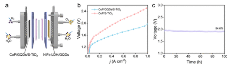 Fig 6. (a) 實(shí)驗(yàn)室規(guī)模 AEM 電解槽的示意圖。 (b) 使用 CoP/GQDs/S–TiO2 和 NiFe LDH/GQD 組合以及 CoP/S–TiO2 和 NiFe LDH/GQD 組合的設(shè)備的整體水分解極化曲線。 (c) 在 1.0 A cm–2 電流密度下,基于 CoP/GQDs/S–TiO2 的 AEM 電解槽的耐久性測(cè)試。