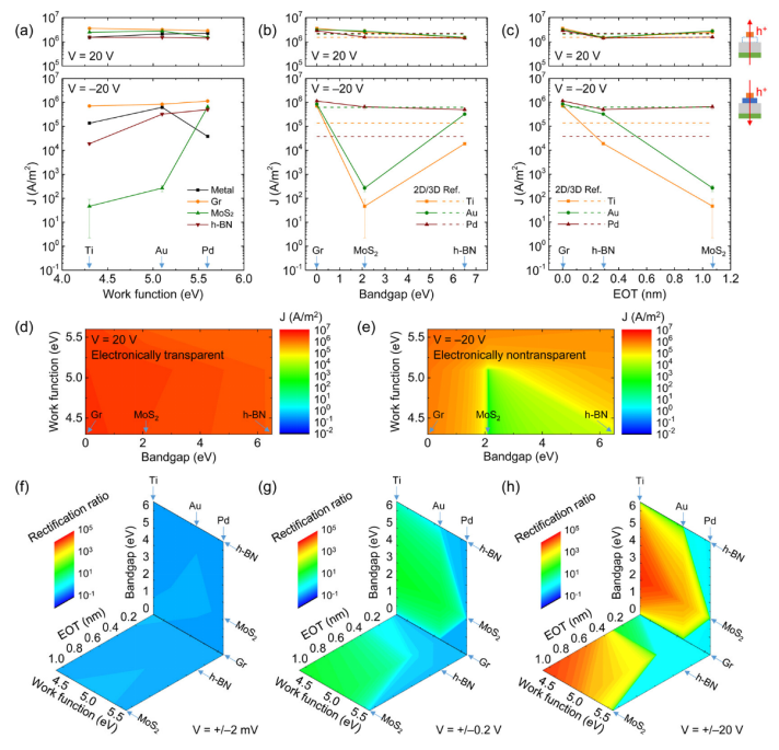 圖3. 利用不同的金屬功函數和二維單分子膜(a–c)J對通過M2DS和MS結的空穴收集(V=20 V,頂部)和空穴注入(V=−20 V,底部)的OoP載流子傳輸進行操縱,并繪制為金屬功函數、二維單分子膜帶隙和EOT的函數。(b,c)中的虛線表示MS參考連接。(d,e)映射J作為金屬功函數和2D單層帶隙的函數,揭示了V=20 V時2D單層的電子透明度和V=−20 V時的電子不透明度。(f–h)映射各種金屬功函數、2D單層帶隙和EOT的整流比,以及它們作為施加V(±2 mV、±0.2 V和±20 V)的函數的演化。