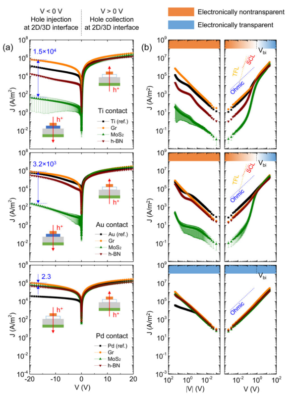 圖2. 比較M2DS結和參考MS結的不同配置的J–V特性。(a) Ti、Au和Pd接觸M2DS和MS組態的半對數J–V特性。在V<0 V時通過頂部M2DS和MS結注入空穴,在V>0 V時通過頂部電極收集空穴。藍色箭頭指示M2DS結中采用不同2D單分子膜的調諧范圍。(b) V<0 V(左)和V<0 V(右)時,Ti、Au和Pd觸點M2DS和MS配置的對數J–V特性。歐姆、TFL和SCL傳輸區由擬合斜率確定。統計分析基于每種類型的20個設備,誤差條表示設備之間的偏差。
