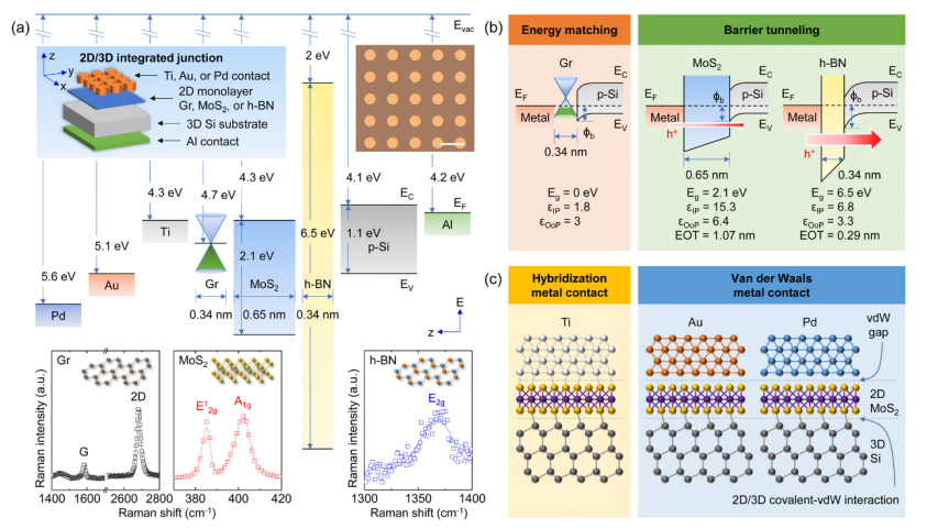圖1. M2DS 異質結以 OoP 載流子為主,通過具有各種金屬接觸(即 Ti、Au 和 Pd)的 2D 單層(即 Gr、MoS2 和 h-BN)傳輸。(a) 示意圖、顯微鏡圖像(比例尺:300 μm)和沿 M2DS 垂直堆棧的能帶圖。這里 Evac、EF、EC 和 EV 分別表示真空的能級、費米能、導帶最小值和價帶最大值。還包括 2D 單層的拉曼光譜(波長:514 nm),其中顯示了每種 2D 材料的特征模式。(b) M2DS 結的能帶圖說明了 Gr 積分的能量匹配效應以及 MoS2 和 h-BN 積分的勢壘隧穿效應。假設混合金屬接觸,因此不涉及 vdW 間隙。(c) Ti 誘導的雜化金屬與 2D 單層 MoS2 的接觸示意圖,與 Au 和 Pd 誘導的 vdW 金屬接觸的比較。