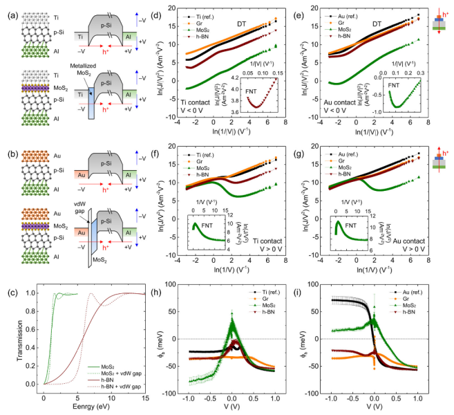 圖5.M2DS結中的勢壘隧穿。(a,b)以MoS2積分為例的Ti和Au接觸M2DS結和參考MS結的示意圖,以及平衡條件下的相應能帶圖。(c) 計算了MoS2和h-BN集成層的量子隧穿幾率隨電子能量的變化。比較了雜化和vdW間隙金屬接觸。(d–g)ln(J/V2)與ln(1/V)特性說明了Ti和Au接觸M2DS配置的DT和熱離子發射載流子輸運。(d–g):ln(J/V2)與1/V特性的插圖說明了MoS2和h-BN集成M2DS配置的FNT載流子傳輸。(h,i)使用溫度變量Arrhenius方法提取零V附近的νb。Ti和Au接觸MS參考結的數據也包含在(d–i)中進行比較。
