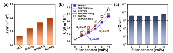 圖4. (a) 相同BN添加量的PEG及其復合材料的導熱性能。(b) BN/PEG、B+G/PEG和BG/PEG復合材料導熱系數的改進Hashin-Shrikman模型擬合。(c) BG/PEG復合材料的體積電阻率。