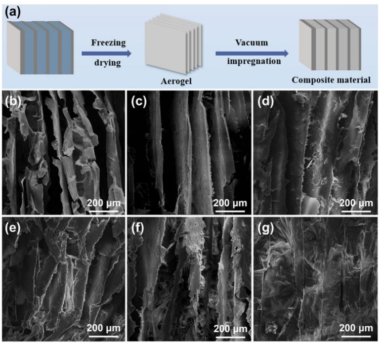圖5. (a) BGA/PEG復合材料的具體制備圖。(b–f)體積分數為2–10%的BGA氣凝膠的SEM圖像。(g) BGA/PEG-6復合材料的SEM圖像。