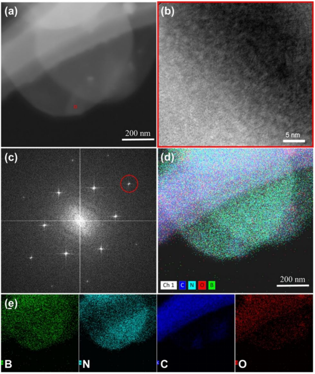 圖2. BNNS-Gr(a)中紅色矩形的TEM圖像(a)和高分辨率圖像(b)(c)(b)的FFT圖像。(d) BNNS-Gr.(e)B、N、C和O元素分布的EDS圖像。