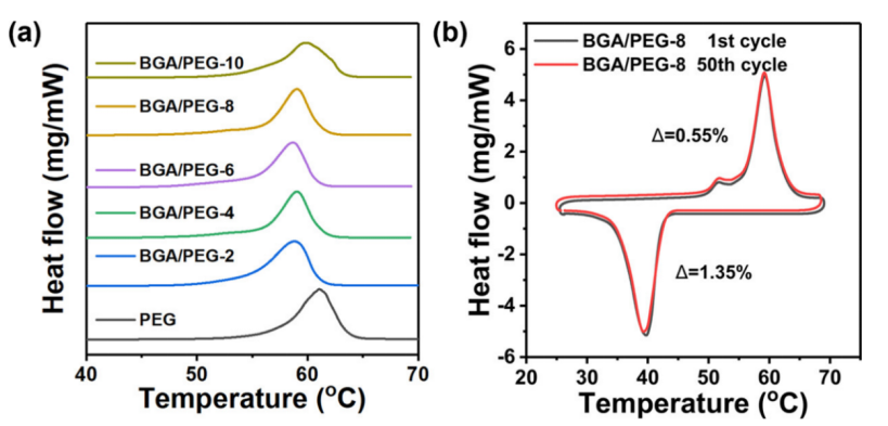 圖8.(a) BGA/PEG復合材料的DSC曲線。(b) 50次循環后BGA/PEG-8的升溫和降溫DSC曲線。