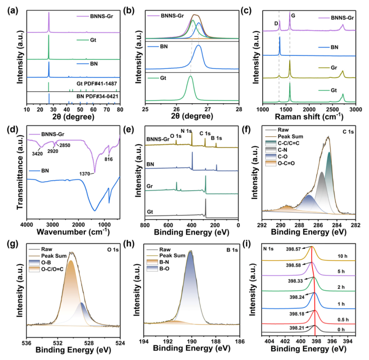 圖3. BN、Gt和BNNS Gr(a)的XRD圖和部分變焦(b)。(c) Gt、Gr、BN和BNNS-Gr的拉曼光譜。(d)BN和BNNS-Gr的FTIR光譜曲線。(e)Gt、BN和BNNS-Gr的XPS光譜,(f)C 1s光譜,(g)O 1s光譜,(h)B 1s光譜,和(i)BNNS-Gr原位剝落的N 1s光譜。