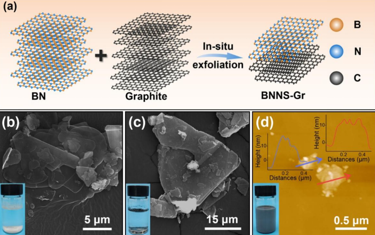 圖1. (a) BNNS-Gr的具體制備圖。(b)BN的SEM圖像。(c)石墨的SEM圖像。(d) BNNS-Gr的AFM圖像和插圖中顯示的高度信息。藍色插圖顯示BN、石墨和BNNS-Gr水分散體。