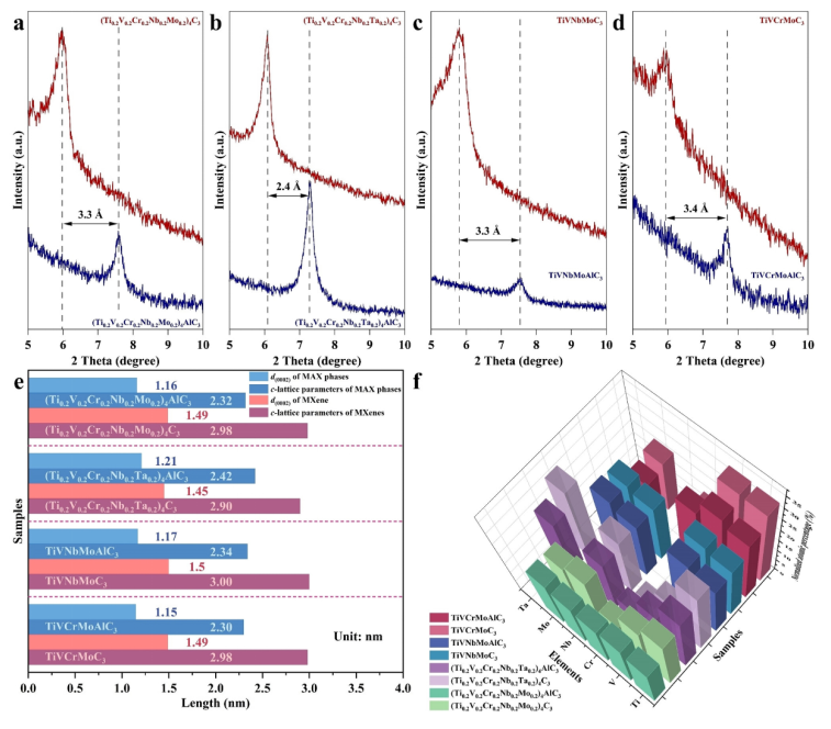 Fig 5. 高熵MAX相及其衍生的高熵MXenes在5°至10°范圍內(nèi)記錄的X射線衍射(XRD)圖譜對比。(a) (Ti?.?V?.?Cr?.?Nb?.?Mo?.?)?AlC? 及其衍生的 (Ti?.?V?.?Cr?.?Nb?.?Mo?.?)?C?。(b) (Ti?.?V?.?Cr?.?Nb?.?Ta?.?)?AlC? 及其衍生的 (Ti?.?V?.?Cr?.?Nb?.?Ta?.?)?C?。(c) TiVNbMoAlC? 及其衍生的 TiVNbMoC?。(d) TiVCrMoAlC? 及其衍生的 TiVCrMoC?。(e) 高熵MAX相及其衍生的高熵MXenes的d(0002)面間距和c軸晶格參數(shù)匯總。(f) 高熵MAX相及其衍生的MXenes的電感耦合等離子體(ICP)數(shù)據(jù)。