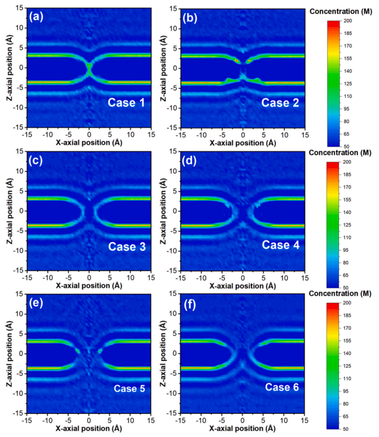羥基(-COH)修飾使孔道表面形成親水“通道”,平面內濃度分布呈帶狀高密度區(密度3.1 g/cm³)。邊緣區域因靜電排斥作用抑制離子吸附,維持濃度穩定性(波動<5%)。