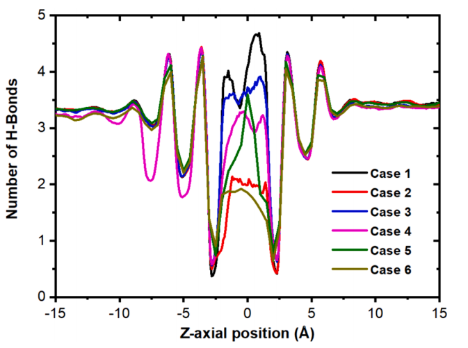 各案例氫鍵分布特征與機制解析:Case1(G0-CH,小孔徑)分布特征:氫鍵密度在孔道中心形成尖銳單峰(峰值密度~3.2 bonds/nm³),沿Z方向分布范圍狹窄(<1 nm)。氫鍵壽命較長(>10 ps),表明水分子形成穩定的類冰結構。