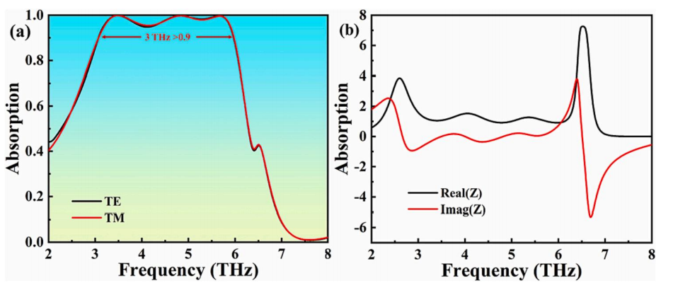 圖3。 (a) 吸收體的吸收光譜 (b) 吸收體的相對阻抗。