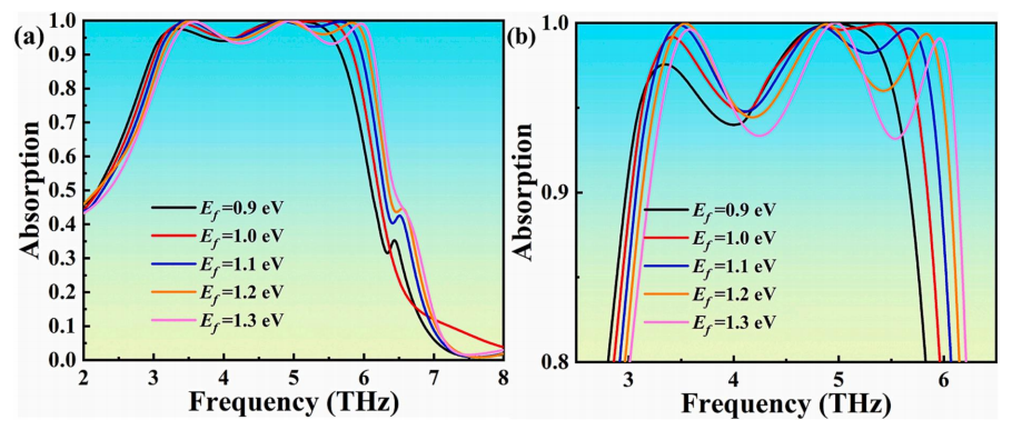 吸收器采用三層設計:單層石墨烯(調控核心)、介質層(介電常數可優化)、金屬反射層(全反射基底)。通過有限元法模擬驗證,化學勢升高時吸收峰向高頻移動,帶寬隨之擴展。例如,化學勢從0.2 eV增至0.8 eV時,帶寬由0.23 THz擴展至0.83 THz,且對入射光偏振狀態無敏感響應。
