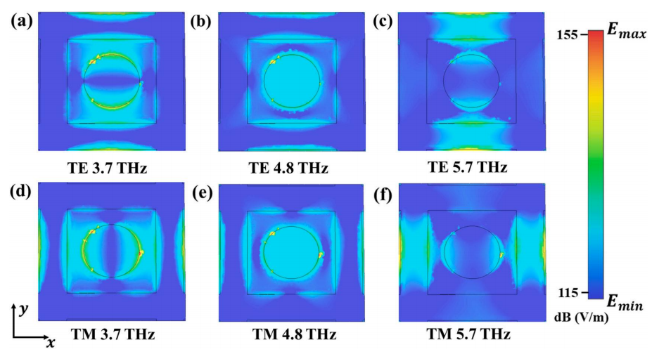 圖6。吸收劑的電場分布 (a) TE模式 3.7 THz (b) TE模式 4.8 THz (c) TE模式 5.7 THz (d) TM模式 3.7 THz (e) TM模式 4.8 THz (f) TM模式 5.7 THz。