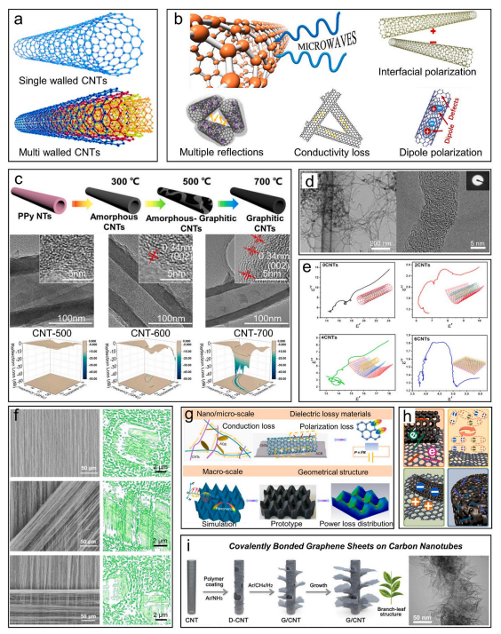 圖4.CNT用于微波吸收。(a) 單壁和多壁CNT的晶體結構。經Ref. 許可轉載。(b) CNT的主要微波損耗機制。經Ref. [87-91]許可轉載。(c) 不同非晶-石墨比CNT的制備及其相應的微波反射損耗。經Ref. 許可轉載。(d) 非晶CNT的透射電子顯微鏡(TEM)圖像。經Ref. 許可轉載。(e) 不同壁層CNT的Cole-Cole圖。經Ref. 許可轉載。(f) 不同交錯角(0°,45°,和90°)的交叉堆疊對齊CNT的掃描電子顯微鏡(SEM)圖像及相應的電荷密度分布。經Ref. 許可轉載。(g) 人工設計的CNT基復合結構中的介電共振。經Ref. 許可轉載。(h) CNT基氣凝膠的微波吸收機制。經Ref. 許可轉載。(i) 與石墨烯片結合的CNT的制備及形貌。經Ref. 許可轉載。
