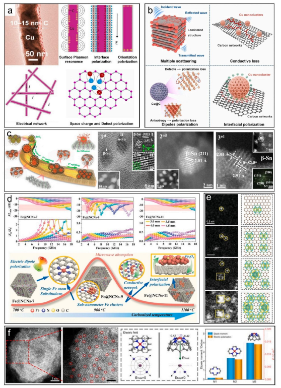 圖7.用于微波吸收的碳/非磁性金屬復合材料。(a) Cu/C核殼納米線和它們的介電響應機制。經許可轉載自參考文獻[136]。(b) Cu納米團簇-碳網絡復合材料的電磁波吸收機制。經許可轉載自參考文獻[137]。(c) Sn納米顆粒在碳基體中的分裂過程和相應的透射電子顯微鏡圖像。經許可轉載自參考文獻[138]。(d) Fe單原子和亞團簇@氮摻雜碳納米籠的微波吸收性能和介電損耗機制。經許可轉載自參考文獻[139]。(e) 氮摻雜石墨碳上的Co單原子和團簇。經許可轉載自參考文獻[140]。(f) 非平面石墨烯上的Fe單原子及其介電特性。經許可轉載自參考文獻[141]。