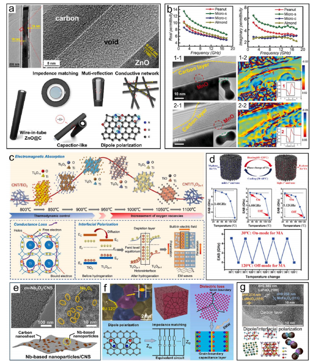 圖8. 用于微波吸收的碳/介電氧化物復合材料。(a) 一維管中絲狀ZnO@碳納米線和它們的介電損耗。轉載自參考文獻[152]。(b) MnO@C在不同納米結構下的介電參數和電荷密度分布。轉載自參考文獻[153]。(c) Ti?O??-1/CNTs復合材料的相變過程和微波吸收機制。轉載自參考文獻[155]。(d) 可逆介電變化和r-GO/VO?復合氣凝膠的“開/關”可切換微波吸收性能。轉載自參考文獻[156]。(e) 超細空位豐富的Nb?O?/碳納米片復合材料。轉載自參考文獻[157]。(f) 具有大角度晶界及其介電響應的Fe基氧化物/碳復合材料。轉載自參考文獻[158]。(g) MnFe?O?/LaMnO?/LaFeO?異質結構和缺陷豐富的碳納米復合材料用于增強的介電損耗。轉載自參考文獻[159]。