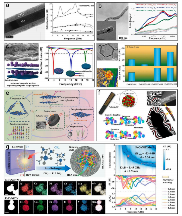 圖10。用于微波吸收的碳/磁性金屬復合材料。(a) 封裝在CNTs中的Fe及其2至18 GHz的RL曲線。經許可轉載自參考文獻[168]。(b) 嵌入多壁CNTs中的Fe/Co/Ni及其頻率依賴的介電/磁損耗正切值。經許可轉載自參考文獻[169]。(c) MXene-FeCo納米花薄膜及其RL曲線。經許可轉載自參考文獻[170]。(d) Co@N摻雜碳納米籠及其最大RL值和帶寬。經許可轉載自參考文獻[171]。(e) 高熵MXene/中熵合金復合材料的電磁波吸收機制。經許可轉載自參考文獻[174]。(f) 一維FeCoNi/碳纖維的磁性耦合和重建磁性全息圖。經許可轉載自參考文獻[175]。(g) 通過原位電弧放電法制備的高熵合金@石墨納米膠囊及其優化的微波吸收性能。經許可轉載自參考文獻[176]。