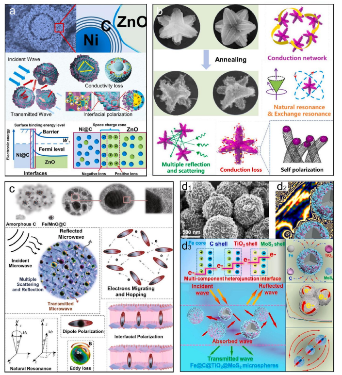 圖12.用于微波吸收的碳/電介質/磁性多組分復合材料。(a) 蛋黃殼結構Ni@C@ZnO復合材料及其微波吸收機制。經參考文獻[187]許可轉載。(b) 六角星形、花形Co@ZnO@N摻雜碳復合材料和磁介電損耗機制。經參考文獻[188]許可轉載。(c) 嵌入非晶碳基體中的核殼Fe/MnO@C納米膠囊和電磁波衰減機制。經參考文獻[189]許可轉載。(d1) 多殼Fe@C@TiO2@MoS2異質結構的掃描電子顯微鏡圖像,(d2) 重建的磁性全息圖,以及(d3) 微波吸收機制。經參考文獻[190]許可轉載。