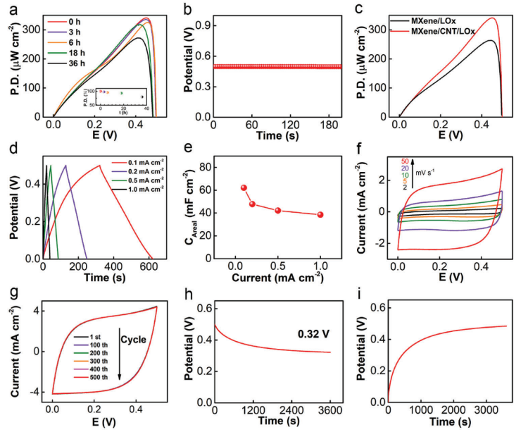 a) 在0.5 M PBS含15 mM乳酸條件下,不同時間(至36小時)的功率密度-電壓曲線及功率密度保持率(插圖為實物照片);b) 相同條件下的開路電壓(OCV)曲線;c) 分別以MXene/LOx和MXene/CNT/LOx作為生物陽極時的功率密度-電壓對比曲線;d) 0.5 M PBS中不同電流密度下的恒電流充放電曲線,e) 對應面積電容計算結果;f) 不同掃描速率下的循環伏安(CV)曲線;g) 0.5 M PBS中以100 mV s?¹掃描速率進行500次CV循環的穩定性測試;h) 不含乳酸的0.5 M PBS中,BSC裝置充電至0.5 V后的自放電曲線;i) 含15 mM乳酸時的自充電曲線。