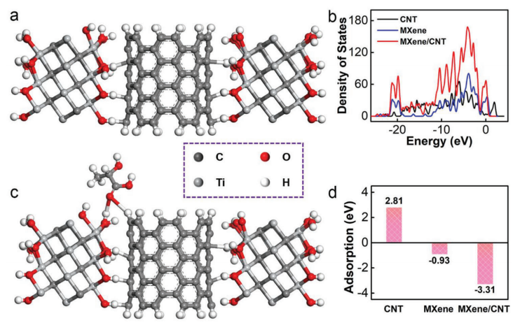 a) MXene/CNT的優化晶體結構;b) CNT、MXene及MXene/CNT的總電子態密度;c) MXene/CNT的優化吸附模型;d) C3H6O3(乳酸)在CNT、MXene及MXene/CNT晶格上的吸附能對比。