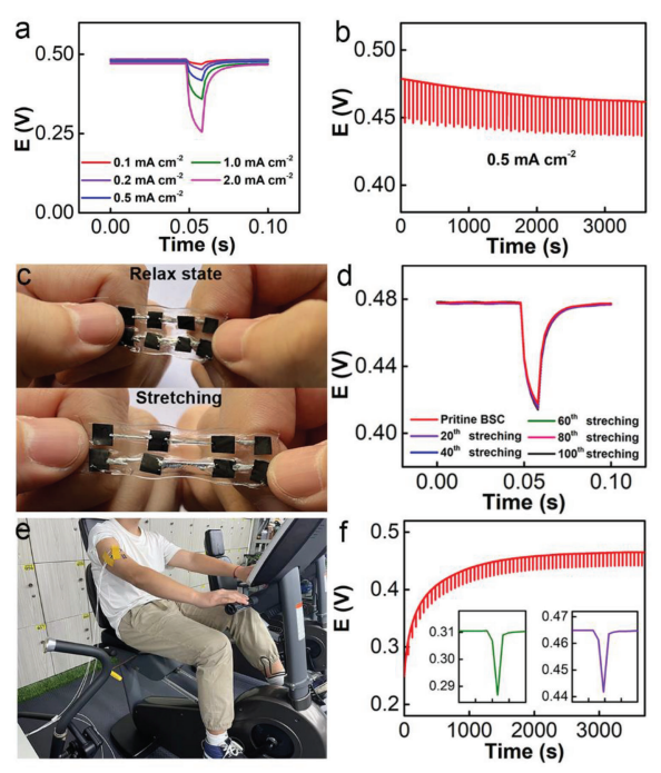 a) 不同電流密度下記錄的BSC裝置脈沖放電曲線;b) 0.5 mA cm?²電流密度下,以60秒靜置間隔進行的1小時脈沖放電-自充電循環曲線;c) BSC裝置在松弛狀態與100%拉伸狀態下的示意圖;d) 經歷100次拉伸循環后的脈沖放電-自充電曲線(測試條件:0.5 M PBS含15 mM乳酸);e) 志愿者騎行健身車時BSC裝置貼附于手臂的示意圖,f) 實驗室監測健身場景下采集汗液后的輸出電壓(插圖為首周期與末周期的脈沖輸出實物照片)。