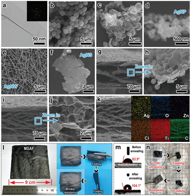 l) MGAF實物照片(9 cm×9 cm,展示定制尺寸)、水平-垂直折疊及回彈過程(展示抗皺性能);
