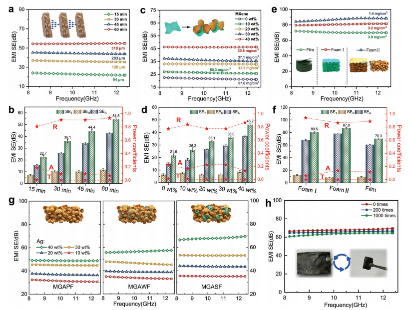 g) MGAPF(銀顆粒)、MGAWF(銀納米線)、MGASF(銀納米片)在不同Ag含量下的EMI SE;