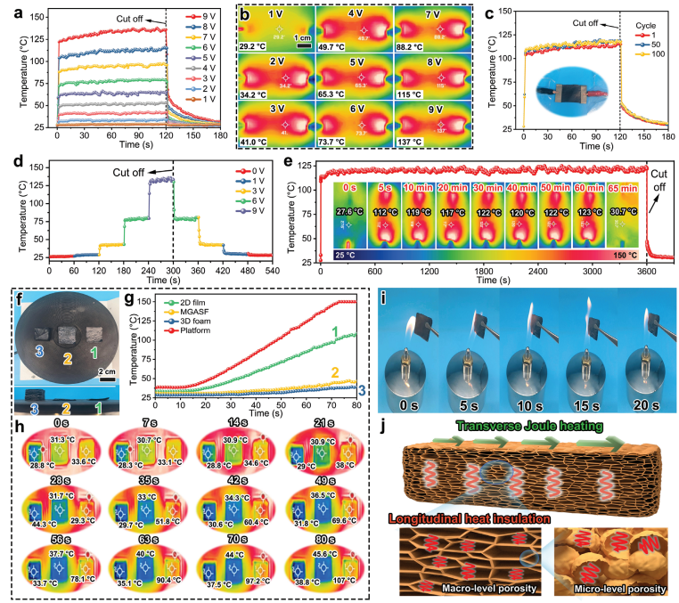 j) MGASF熱管理機制示意圖(包括焦耳熱效應、縱向隔熱與阻燃性)。