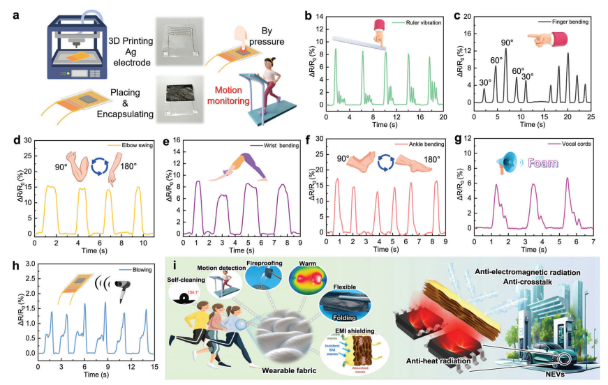 a) 叉指電極微電子印刷、器件封裝及運動監測示意圖;
