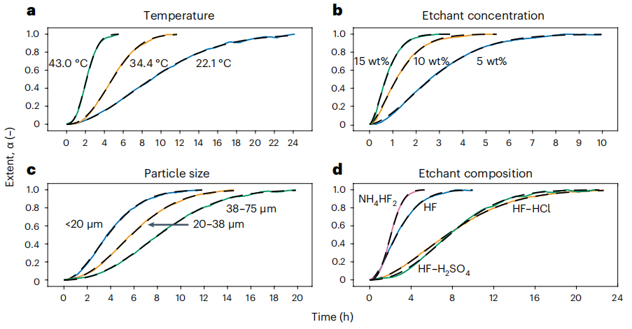 圖1 | Ti3AlC2 MAX相蝕刻反應的蝕刻程度-時間動力學曲線。a–d分別展示了不同參數變化下的實驗結果:溫度(a)、HF蝕刻劑濃度(以wt%表示,對應2.89、5.78和8.67 M三種濃度)(b)、Ti3AlC2 MAX顆粒尺寸(c)以及蝕刻劑成分(d)。虛線表示通過Avrami-Erofe’ev(n非固定)模型擬合的曲線。本圖經美國化學會授權改編自參考文獻。