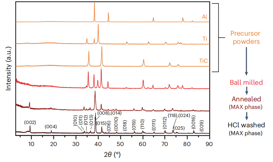 圖2 | MAX相在合成步驟中的演變過程。通常研究團隊通過判斷9.4°處是否存在(002)衍射峰來確認Ti3AlC2的成功合成。