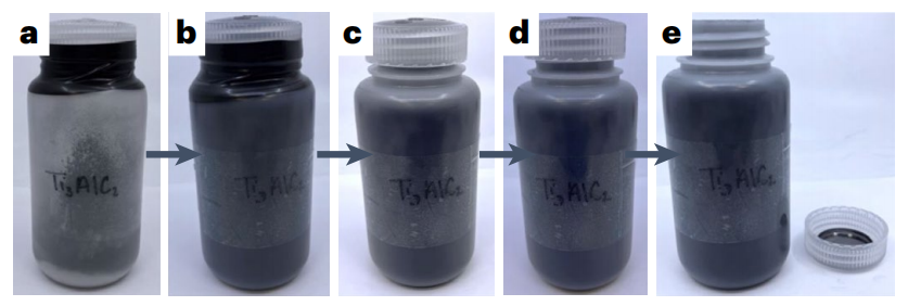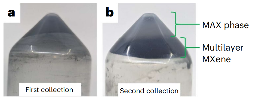 圖4 | 剝離后沉積物的膨脹現象表征剝離效果。a、b分別為剝離收集階段沉積物的動態變化:當單層MXene開始剝離時,沉積物會逐漸膨脹。此時上清液含有單層MXene,而沉積物包含未蝕刻的MAX相和多層MXene混合物。首次離心收集(a)的沉積物呈深色,系MAX相與多層MXene的混合體;經重新分散和二次離心后(b),沉積物呈現部分膨脹狀態,顯示未蝕刻MAX相與多層MXene的初步分離。本圖展示的是Ti3C2Tx材料經LiCl剝離處理后的實驗結果。