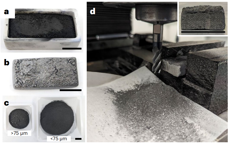 圖7 | MAX相材料批量處理流程(50克規模)。a-d依次展示:球磨后置于坩堝中待退火的預混粉末(a);退火后形成的MAX相塊體(b);經鉆孔破碎并篩分處理的粒徑分級粉末(c);MAX相塊體的數控銑削加工過程(d)。插圖為塊體材料橫截面顯微形貌。比例尺均為2厘米。