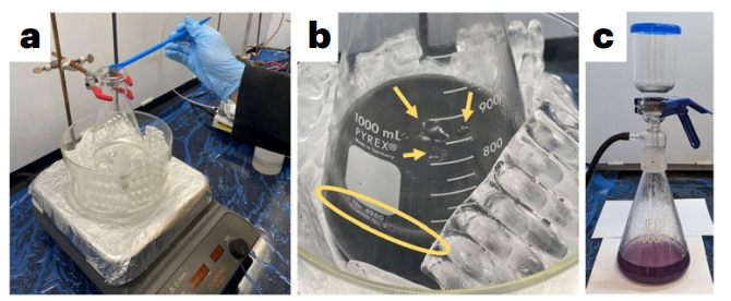圖8 | MAX相鹽酸洗滌工藝流程。a-c依次展示:9M HCl洗滌液配置階段,重點呈現磁力攪拌器參數設置與粉末投加量控制(a);反應進行中產生氣泡的黃色高亮區域(b),需通過降低MAX相粉末投加速度控制發泡強度;采用真空過濾裝置實現酸液與MAX相粉末分離(c),濾液因溶出雜質呈現紫色。不同批次MAX相粉末可能因雜質成分差異呈現不同顏色特征。