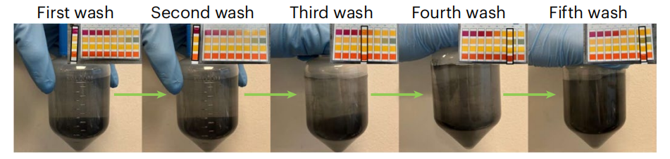 圖9 | 1克刻蝕反應產物的酸洗流程(獲取中性多層MXene)。每輪洗滌采用2550×g離心10分鐘并棄去上清液。需重復洗滌流程直至上清液呈中性,洗滌次數依據反應體系差異調整。隨著洗滌次數增加,離心管內部觀察上清液呈現黑色(管外觀察仍為透明狀)。