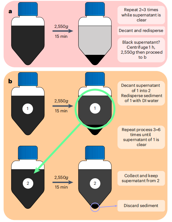 圖10 | LiCl分層洗滌與MXene收集流程。a、脫鹽洗滌階段:以2550×g離心15分鐘棄去含LiCl上清液,沉淀物經去離子水重懸后重復離心,直至上清液轉黑(指示MXene膠體形成);轉入2550×g持續離心1小時實現相分離。b、分級收集階段:將1小時離心沉淀重懸后分裝至試管(1)(2),經15分鐘離心后,試管(1)上清液轉移至試管(2);重復離心收集試管(2)上清液(即單層MXene懸浮液),直至試管(1)沉淀物離心后上清液澄清(殘留物可棄去)。