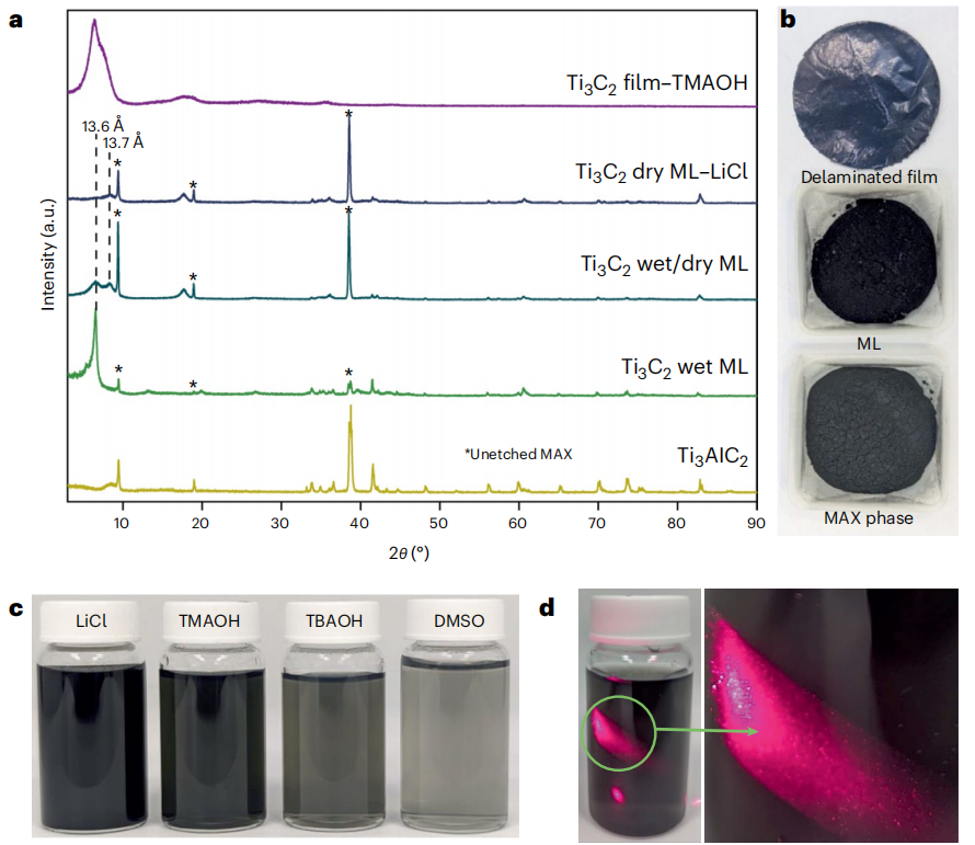 圖11 | MXene合成工藝各階段產物表征圖譜。a、由Ti3AlC2 MAX相前驅體經HF/HCl刻蝕至ML Ti3C2,再經TMAOH與LiCl分層處理獲得單層Ti3C2Tx薄膜的XRD譜演變。需注意:刻蝕階段未完全反應,導致ML MXene的XRD譜中殘留MAX相特征峰。b、合成過程中粉末的宏觀顏色演變(MAX相原粉→干燥ML粉末→對應薄膜)。c、不同分層劑處理所得單層Ti3C2Tx溶液的收集濃度對比。d、激光穿透單層Ti3C2Tx溶液時呈現懸浮納米片的丁達爾效應,驗證膠體穩定性。