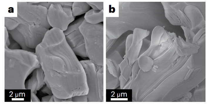 圖3 | MAX相與蝕刻多層結構的對比。a、b分別為Ti3AlC2 MAX相(a)及其經HF/HCl蝕刻后的多層Ti3C2Tx(b)的掃描電鏡圖像。對于HF/HCl蝕刻的多層MXene,與高濃度HF蝕刻的多層MXene不同,未觀察到手風琴狀結構特征。
