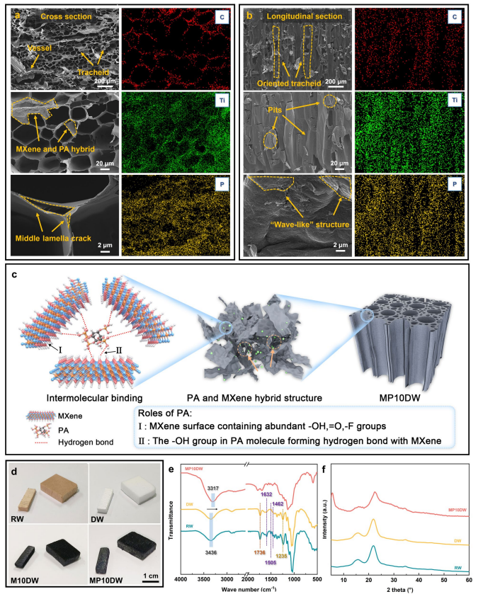 圖3(a)負載MXene與植酸(MP10DW)的木氣凝膠橫截面視圖的場發射掃描電鏡(FESEM)及能量色散譜(EDS)圖像;(b)縱向視圖的FESEM-EDS圖像;(c)植酸(PA)在形成穩定MXene雜化結構中的作用示意圖;(d)天然木材(RW)、脫木質素木材(DW)、MXene修飾木材(M10DW)及MXene/PA復合修飾木材(MP10DW)的實物照片;(e)RW、DW與MP10DW的紅外光譜(FTIR);(f)RW、DW與MP10DW的X射線衍射(XRD)圖譜